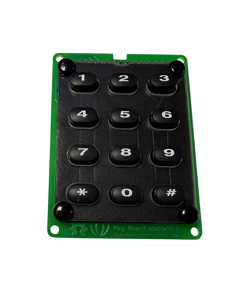 This 4x3 keypad matrix can act as an input for electronics projects using an Arduino or other microcontrollers. Featuring 0-9 numerals, *, and #, this key board could be programmed to represent a variety of functions.The board has 13 pins soldered on to create an easy transition to breadboarding and prototyping. This keypad is the model featured in the RadioShack “Make: Electronics” First Edition Kit (discontinued).