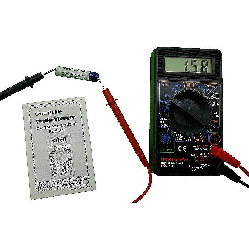 A Digital Multimeter is the most important tool when it comes to electronics. With ProTechTraders PDM-631 you will be able to measure direct and alternating current, resistance, diodes, transistors, continuity, and square wave test signals, all in the palm of your hand! The PDM-631 is very user friendly because ProTechTrader designed it with the beginner in mind. Voltages are color coded in blue and clearly labeled with a V. The AC and DC distinction is also clearly color coded in orange. Unlike other multimeters, each number around the dial has a clear symbol indicating ohms, volts, or amps. The Digital LCD display ensures an accurate visual reading of your results. You can also be certain of your continuity results thanks to the built in buzzer that allows for audible continuity. ProTechTrader designed the user guide to be as user friendly as possible with clearly labeled illustrations throughout.
