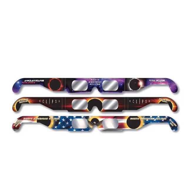 Paper Glasses designed for viewing the Solar Eclipse. Protects eyes when looking directly at the covered Sun. Not recommended for use past 3 minutes straight.