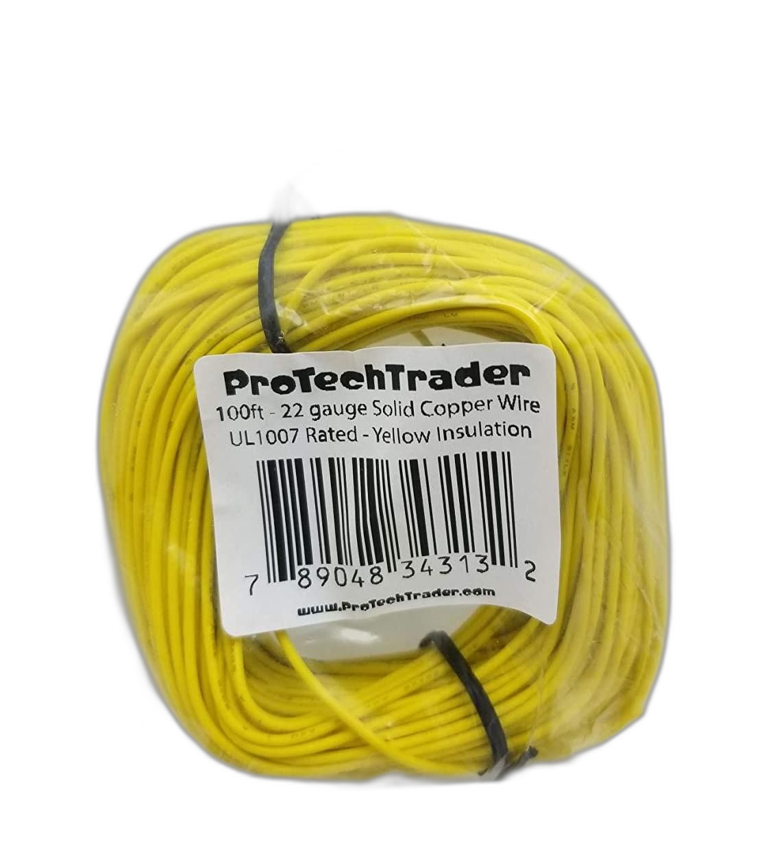 ProTechTrader 789048343132 100ft 22AWG - Solid Copper Wire Yellow PVC UL1007 Rated 300V 80℃ - Electronics Hookup Wire Tinned - Bagged