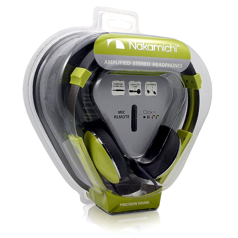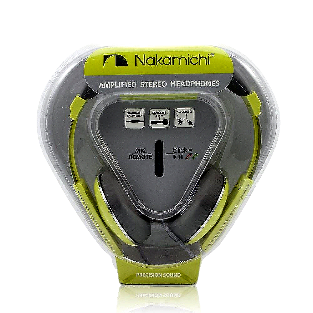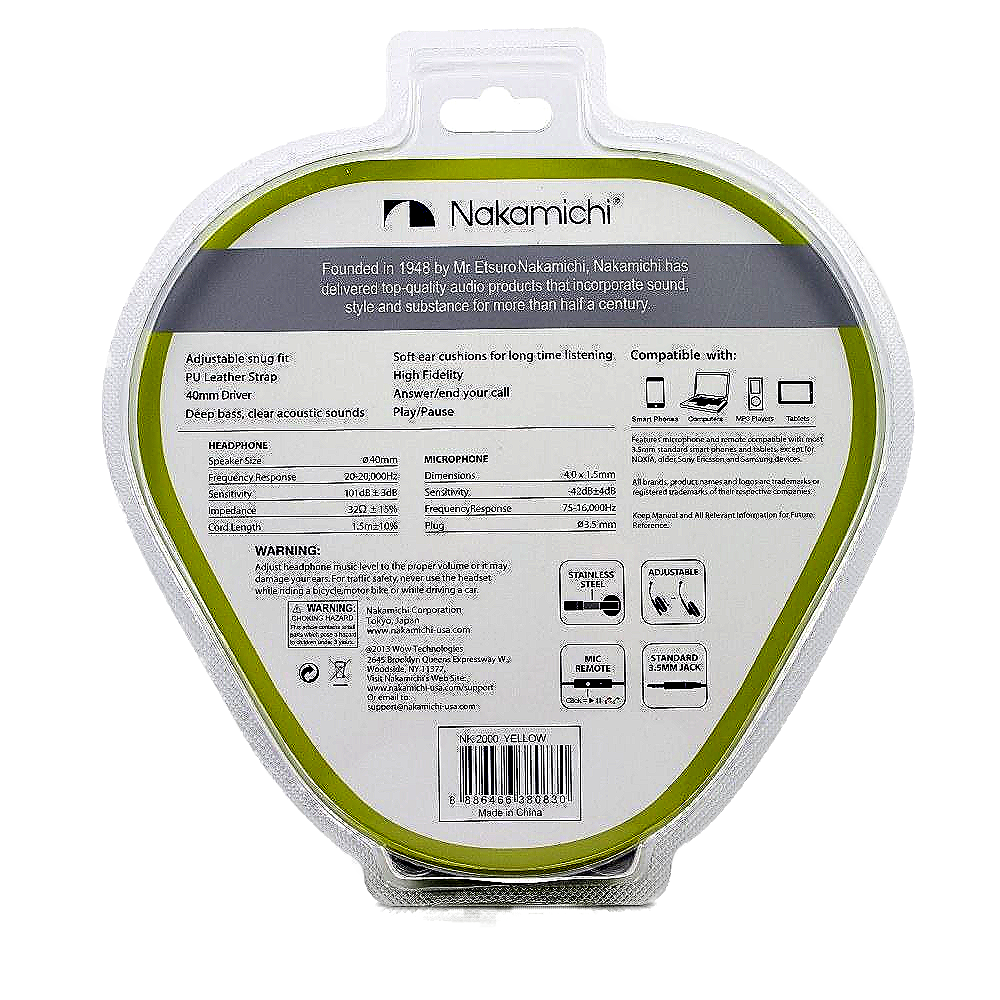 Product description: 888646638083 Nakamichi Amplified Stereo Headphones NK2000 Yellow Nakamichi Amplified Stereo Headphones NK2000 Yellow Technical Details Adjustable Ear-cup with Stainless Steel frame Microphone included