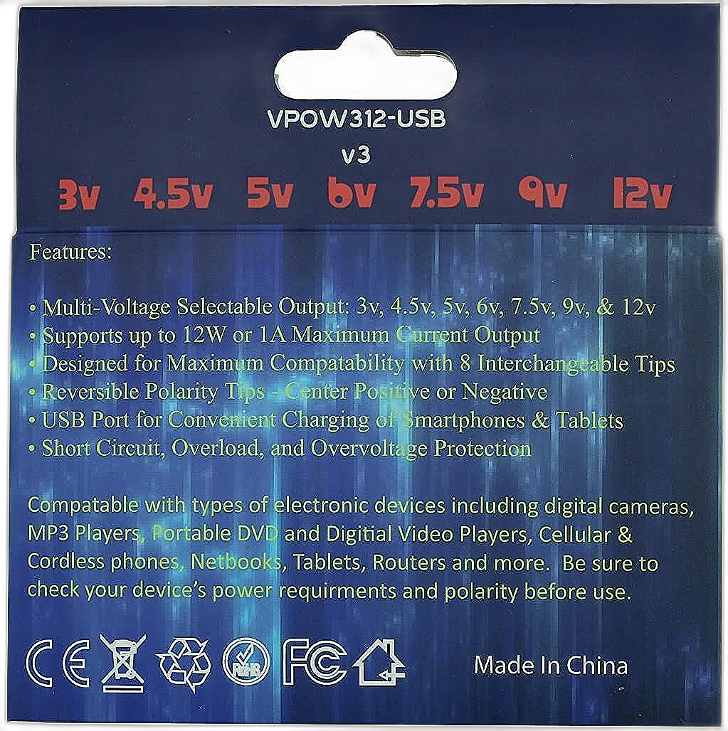 - Multi-Voltage 12 Watt (12w/1-amp) replacement switching power adapter supply compatible with 1000s of small electronic devices using requiring 3 volt, 4.5 volt, 5 volt, 6 volt, 9 volt, or 12 volt up to 1.0a or 12 watts including many Electronics, Tablets, Routers, Smart Phones, Speakers, Monitors, TVs, LCDs, Cameras & Other USB Port Charging up to 12watt 1000ma with US 120 volt Plug