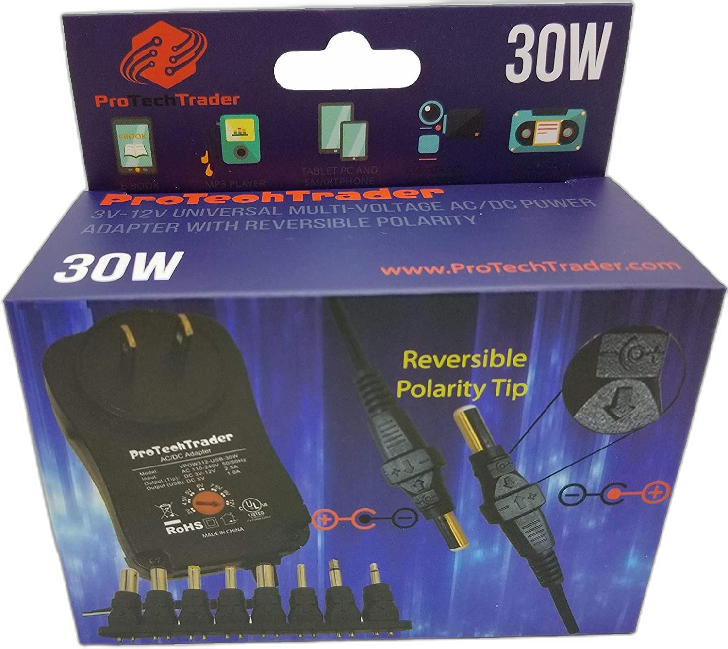 ProTechTrader 789048343118 30w Universal Power Supply Reversible Polarity 3v-12 Volt DC 2.5 amp USB Port 8 Adapter Tips