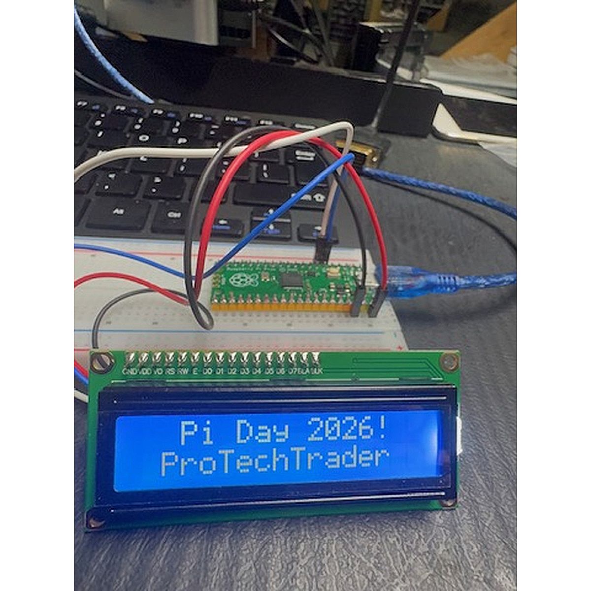 - Experiment 2: LCD Scrolling Pi Digits — Display the first 100 digits of Pi scrolling across a 1602 LCD screen with "Happy Pi Day from ProTechTrader.com" scrolling on the bottom line. Splash screen shows "Pi Day 2026! / @ProTechTrader"
