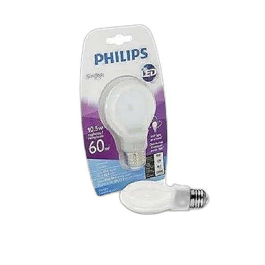 Philips SlimStyle 10.5W 60W Daylight A19 Dimmable LED Light Bulb 5000K 824984 Philips SlimStyle 60W Equivalent Daylight (5000K) A19 Dimmable LED Light Bulb is the same size as a traditional A19 light bulb but with a new, sleek, flat design. Fully dimmable and with a medium base, this bulb replaces your current 60W incandescent A19 and costs about $1.26 per year in energy costs. This 10.5W bulb uses $28.88 of electricity over its 25,000 hour life, a $136.13 savings when compared to the $165.00 required to run a 60W, 800-lumen incandescent A19 bulb over the same period. Philips SlimStyle A19 LED provides 360 degree, all around light. The unique shape of the Philips SlimStyle allows it to be used in more applications than your traditional A19, including table lamps, floor lamps and wall sconces.