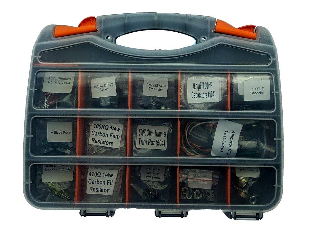 • Double Sided Storage Carrying Case with over 30 compartments to keep your electronics organized - Configurable to hold your completed circuits as well.